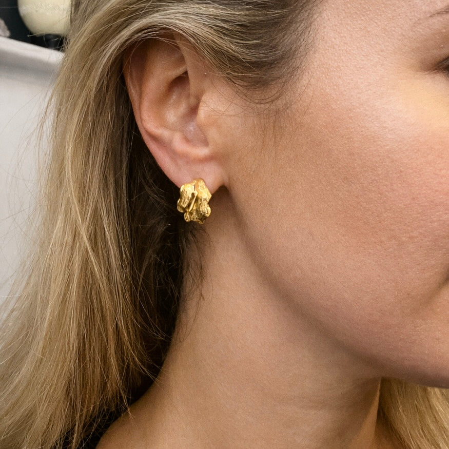 Sculptural and striking, these textured hoops are inspired by the fluid movement of molten metal. Their organic, freeform shape wraps around the ear with an effortless curve, while the rippled surface adds depth and an interesting effect.