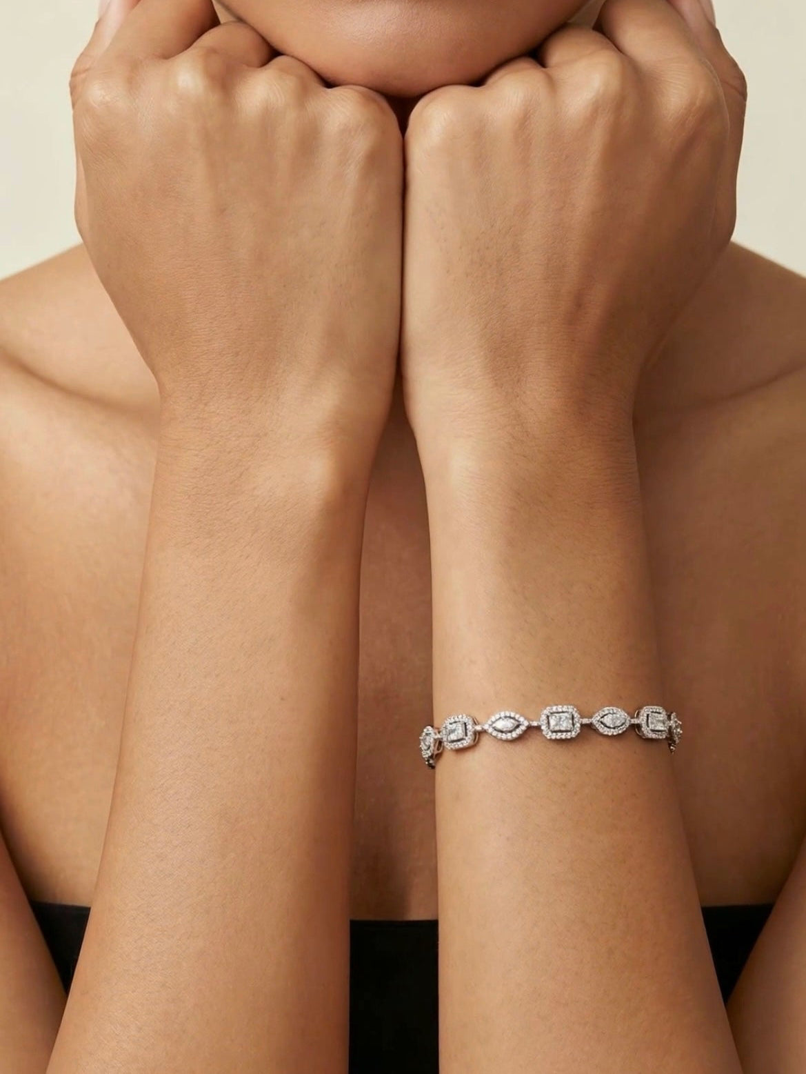 Elevate your everyday elegance with this timeless diamond-inspired bracelet. Crafted with a refined sequence of geometric links, each segment is set with shimmering stones that create a seamless flow of brilliance around the wrist.